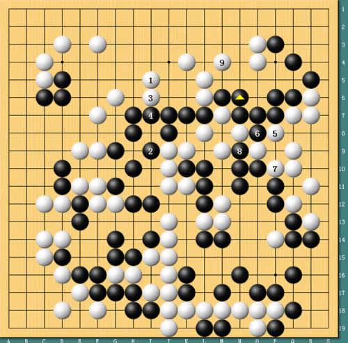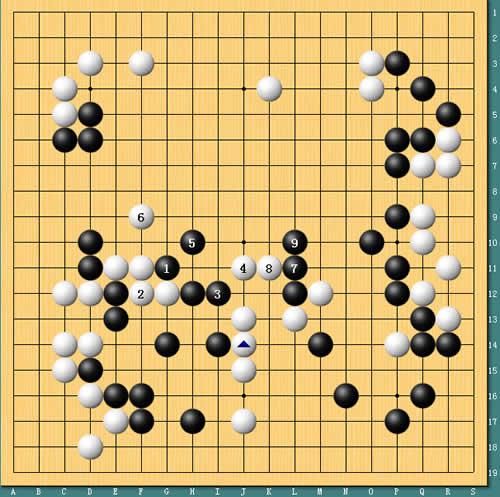 图8:大弃子本可“柳暗花明”。实战刘星在中央顽强作出一个劫来,但劫材有些不利。但此时刘星其实有一个大规模弃子的方案值得考虑。如图,白棋先收住上边边空,黑棋要补活大龙,然后白棋再先手补掉右边的毛病,抢到9位最后的大官子,仔细点目下来,再考虑到崔哲瀚罚点的关系(当时崔哲瀚已经被罚两点),形势竟然意外的细微,刘星还有争胜的余地。可惜实战刘星没有走出这个变化。