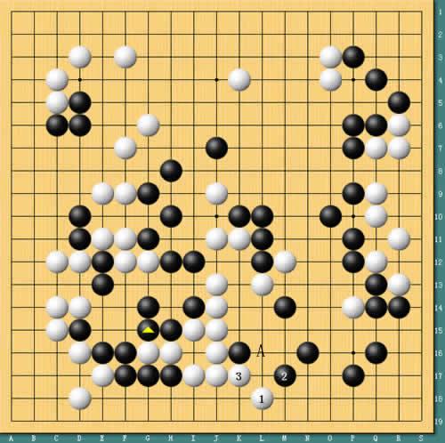 图6:刘星忽略的招法。据国家队的棋手们研究,白棋94手时应该如图般走“小飞”,黑棋尖的时候,3位是做眼的要点。如果黑棋第2手在图中3位冲的话,白棋有在A位“夹”的反击手段。这样局部相当复杂,但白棋做活的成算很大。