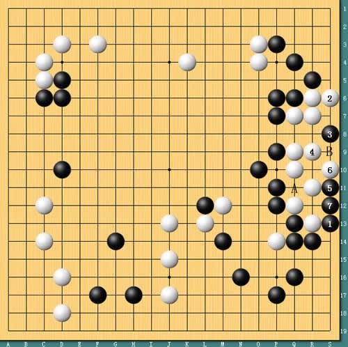 图3:原来是打劫杀。如图为右边白棋死活的变化图,黑棋一路打吃,白棋在2位立是最强手段,但黑棋第5手“托”是好手,白棋A、B两点无法兼得,局部形成劫杀。但不曾预料到的是,这个历史遗留问题,本局两人竟然一直没有时间去解决一下。