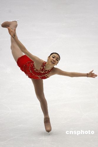 10月8日,2008中国杯世界花样滑冰大奖赛在北京首都体育馆进行第三天的争夺,在女子单人滑比赛中,韩国选手金妍儿获得冠军。她的短节目得分为63.64分,今天的自由滑得分为128.11分,总分191.75分。金妍儿已经连续两年蝉联世界花样滑冰大奖赛总决赛的冠军,今天再度中国站封后。图为金妍儿在自由滑比赛中。中新社发 盛佳鹏 摄