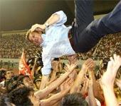 在此我们定格的是功勋主帅图拔被球员抛起庆祝的瞬间,但是表达的却是对两支与冠军无关球队的尊重,浙江绿城和广州医药用两场平局击碎了所有的流言、他们在捍卫联赛公平的同时也点烯了中超联赛的希望。