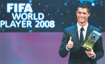 本报讯(记者闫雯雯)昨晨,效力于英超曼联俱乐部的葡萄牙球星C·罗纳尔多在苏黎世歌剧院举行的第19届国际足联颁奖大典上,从球王贝利手中接过了2008年度世界足球先生的奖项,从而实现了包揽本年度欧洲足联俱乐部赛事最佳前锋、最佳球员、国际