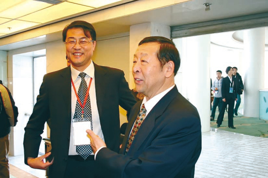 国家体育总局副局长崔大林(右)向辽宁省体育局局长孙永言祝贺。马骋摄