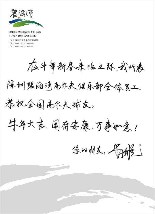 深圳碧海湾俱乐部总经理费海龙向新浪球友拜年 新浪体育 新浪体育新闻官方账号 2009.01.2218:10 关注 深圳碧海湾俱乐部总经理费海龙向新浪球友拜年深圳碧海湾高尔夫俱乐部总经理费海龙 在牛年新春来临之际,我代表深圳碧海湾高尔夫俱乐部全体员工,恭祝全国高尔夫球友: 牛年大吉,阖家安康,万事如意! 您的朋友:费海龙 【球会相关资料】【给球会留言】