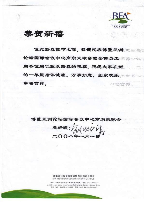 博鳌亚洲论坛高尔夫球会总经理刘炳和向球友拜年