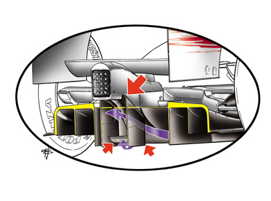 作为“降压”改革重要组成部分,FIA对今年的扩散器进行了相当复杂的改进。新规则的下的扩散器趋于更加标准的外形,消除了中央气流通道和外侧通道在高度上的差异。而且所有三个通道都被加高了,过去扩散器的高度为125毫米,现在增加到175毫米。与此同时,扩散器整体大幅后移,以前扩散器的尾缘基本与后轴持平,现在距离后轴350毫米。
