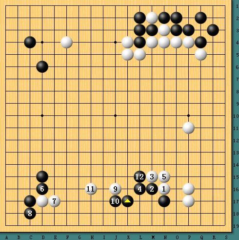 图三,轻率的飞。实战中孔杰1位的飞有些轻率,给白棋留下借用的机会,因此黑7不得不挖一手来补住自身的弱点。李喆继续贯彻轻处理的原则,白棋第8手脱先价值极大,第10手应当在10位先进行交换,再于12位守住大模样,左边的白棋弹性很好,并不受攻。
