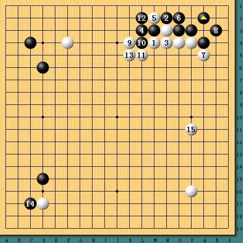 图一,孔杰执黑VS李喆。序盘李喆布局中白1选择了不常用的定式,理由是左上角白棋留有“三三”位的托,白大体上看不错。黑14可以看出孔杰有意将右边的大场让给白棋,意图是贯彻自己先拿实地的策略。