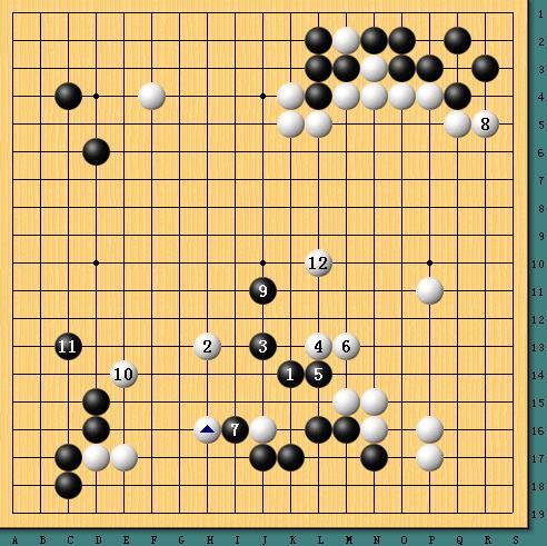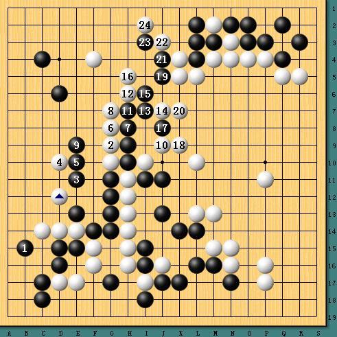 图六,功亏一篑。实战孔杰选择了1位跳补住左下角的弱点,那么中央黑棋的两块棋筋自然成为李喆攻击的对象,李喆经过2-8的次序后,黑棋只好在9位长出,而白10尖出后孔杰竟然无法将棋筋涨到6气,实战至白24扳黑棋的棋筋遭到净杀。