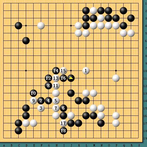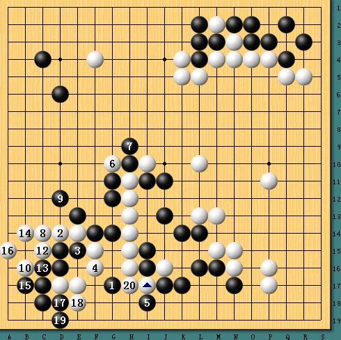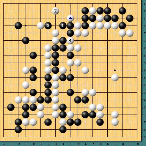图四,稍显急躁。白1没有在左边进行交换就守住中腹的下法稍稍有些急躁,实战遭到孔杰2位的猛攻,白棋被完全封锁,处境相当危险,好在黑棋自身也留有一些弱点可供李喆腾挪。黑18是攻击的好手,局部形成复杂的攻杀。