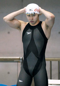 | 日本泳将北岛康介身穿鲨鱼皮在2008年北京奥运会上。 |