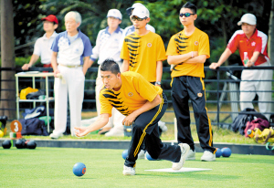草地滚球是一项集运动竞技和休闲娱乐为一体的时尚运动,已有数百年的历史,比赛可分为男女或男女混合组成两队参赛,比赛时双方运动员轮流向预先预定的目标球发出滚球,最终滚球以靠近目标为赢。图为马来西亚选手在比赛中。(本报记者 吴峻 文/图)