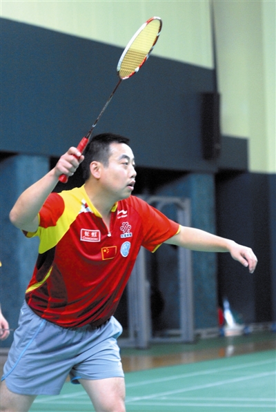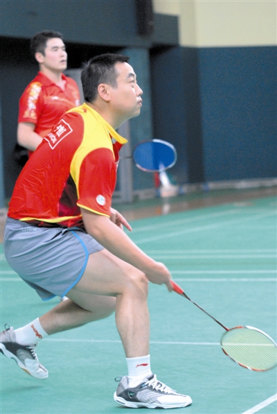 刘国梁上身穿着红色短袖乒乓球队服,下身穿了一条休闲短裤,脚上穿的还算专业的羽毛球鞋,与教练刘国正配对,两人对手则是男队教练肖战和乒羽中心的一位工作人员。记者在现场看到,刘国梁反应够快,多次在后场将球救起,更有意思的是,刘国梁打羽毛球的动作完全套用了乒乓球的打法,这让刘国正连连称好,“动作不好看,但很实用。”两局下来,刘国梁与刘国正将比分追成1比1。决胜局,两人在领先的大好形势下,由于体力不支,两位世界冠军组合还是输掉了比赛。
