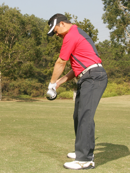 在教学过程中有一个很好的修正方法来修正释放过早。取一支1号木,反过来抓住球杆的杆身。挥杆的时候听球杆运动中发出“呼”的声音,如果释放过早的话,球杆发出的声音会在身体的右边。如果释放正确的话,应该是在身体的前方或者身体前方稍左的位置发出声音。只要让声音在身体前方靠左的位置发出就可以有效调整释放过早的问题。