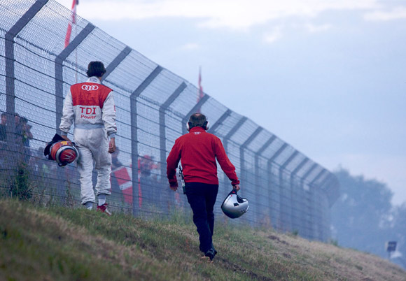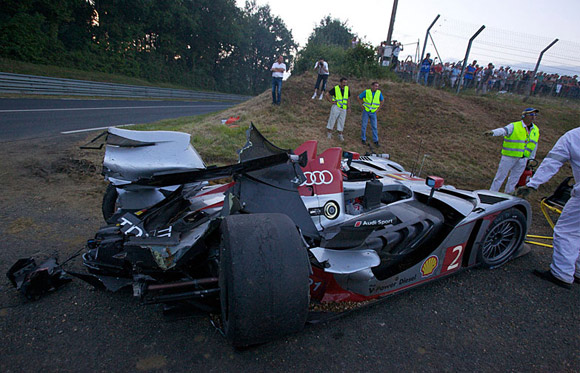 第七小时,厄运降到了奥迪头上。驾驶2号奥迪的卢赫尔在保时捷弯撞车,R15顶上轮胎墙后,后悬挂碎裂。卢赫尔无奈的离开了赛车退出比赛。奥迪汽车运动主管乌尔里奇在维修站接受勒芒官方直播采访时初步判定是机械故障导致。