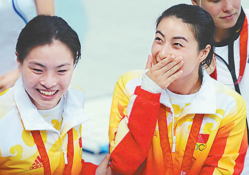 郭晶晶(右)与吴敏霞夺得北京奥运会冠军后笑口难掩。