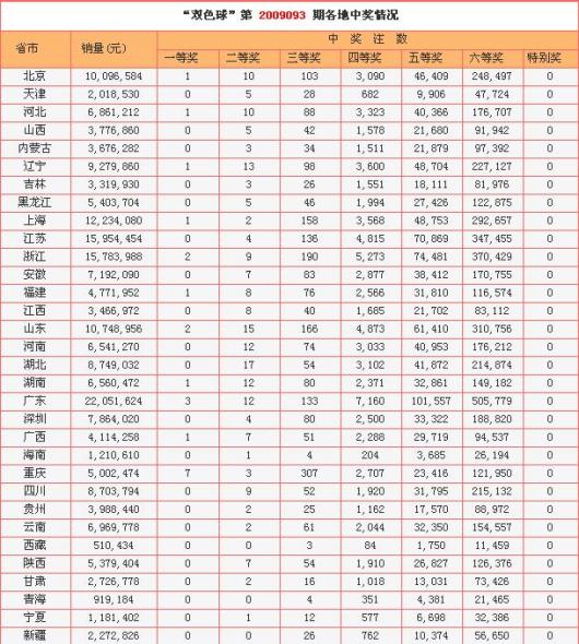 北京时间09年08月11日晚,双色球第09093期开奖,当期开出红球01 11 20 31 32 33;蓝球01。头奖井喷21注,单注奖金542万,21注头奖分别被11省市彩民所瓜分,其中重庆1彩民独揽7注,中得3883万;二等奖爆出198注,单注奖金仅6万7。本期销量为2.09亿,奖池则下降至2.15亿。
