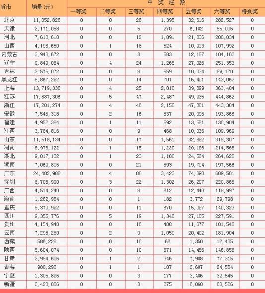 从二等奖中奖情况来看,当期头奖的轮空不仅仅“归功”于蓝球冷号,猜中全部6个红球的彩民也并不多——全国中出了39注二等奖,单注奖金额达到了比较可观的51.86万元。39注二等奖分别中出于15个省、市。其中,江苏和四川分别中出5注,辽宁、上海、浙江和广东各中得4注,深圳中得3注,安徽和云南各中出2注,其余二等奖分别在山西、福建、河南、湖北、甘肃和青海中出。