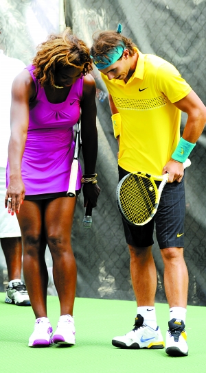 昨日,众多明星在纽约为即将开始的美网造势。小威(左)与纳达尔凑在一起私语。图/CFP