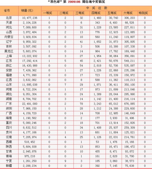 本期销量高达2.18亿,销量排名全国前五位的分别是:广东(2249万)、江苏(1729万)、浙江(1643万)、上海(1322万)和山东(1189万)。当期计奖结束后,奖池金额比上期略有上升,达2.63亿。丰厚的奖池加上超过两亿的销量,为周日晚开奖的09107期双色球的头奖提供了足够的奖金支持,下期高等奖继续按照“523”政策派发,彩民也仍然可以实现2元冲击1000万的梦想。(新彩)[您认为双色球头奖将会在几期内实现爆发]