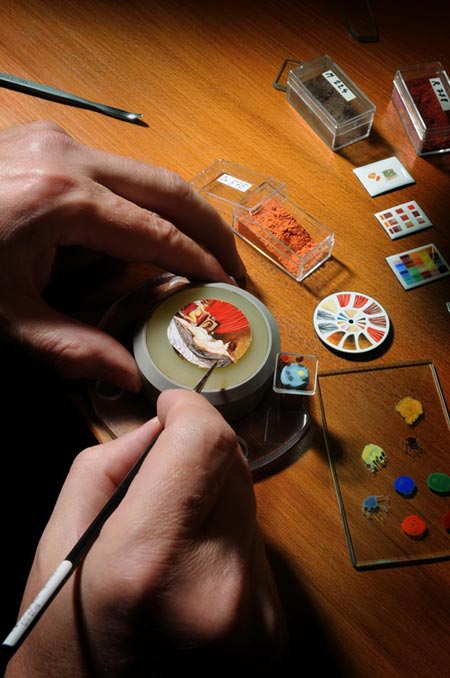 每一个微绘的作品都是长期工艺制作的结果。开始时反复涂上多层透明白色的珐琅层作为明亮的底色。再以不同的氧化金属颜料添加到珐琅底色上,从而产生一系列的丰富色调。具绚烂色彩的珐琅通过鹅毛笔或非常细的画笔描绘出图案。然后将珐琅进行多次焙烧,直至达到理想的色彩微妙变化效果。一件杰作的最后成功关键取决于轮廓是否够精细和清晰。每一步的焙烧都在高温下进行(介乎800度到850度高温)。焙烧是作品成型过程中风险最大的一个步骤。这就是高温烘焙珐琅技术。