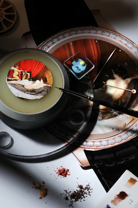 此外,为了保证钟表完美的机械性能,珐琅彩绘师在进行操作时需极其精准,务求不超过最小的误差限制,即2/10th 毫米。微绘珐琅作品是所有绘画艺术中最稀有且最珍贵的。要完成一件如此细小的作品需要数星期的高度集中工艺,更需要耐心、细致以及灵活的指法。同时亦要懂得控制时间,这样一个表盘的制作需要80至150个小时。