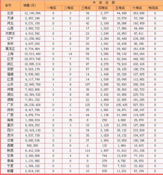 本期二等奖爆出126注,单注奖金为16.5372万。全国24个省、市、自治区中得二等奖,,其中海南中出35注、上海中出14注,湖北和山东中得9注、江苏中出7注较、辽宁中出6注、浙江和河南中出5注、甘肃中出4注较为突出,其他各地均在3注以内。