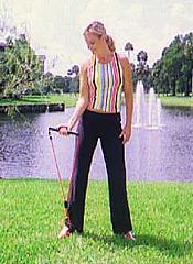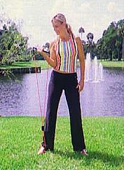 站立,双脚分开,与肩等宽,将脚套在拉力器上,一只手抓住握把。缓慢将手臂向上抬起。 将其保持在肩部高度,持续几秒钟,然后重复几次。然后切换至身体另一侧,以同样的方法重复前面的过程。增加肩带肌肉的柔韧性,以便在上杆时身体具有更好的稳定性。