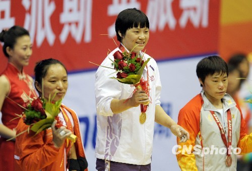 10月18日下午,河南选手李雪英在第十一届全运会女子58公斤级抓举、挺举赛中,以总成绩第一夺得冠军。中新社发陈文 摄