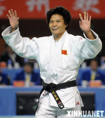 10月20日,广东队选手冼东妹庆祝胜利。当日,在第十一届全运会柔道比赛女子52公斤级决赛中,冼东妹战胜湖南队选手何红梅,夺得冠军。新华社记者徐家军摄