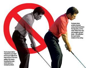 图片说明:有人说,“从髋关节开始弯曲”,但是你知道如何去做才是正确的吗?对于大多数人来说,知道是一回事,而实践又是一回事,知识与实践脱节必然导致击球时弯腰驼背(图左)。而正确姿势是,挺直脊椎,从髋部而非从腰部开始弯曲。注意我此时背部挺直,有利于挥杆时转动身体(图右)。