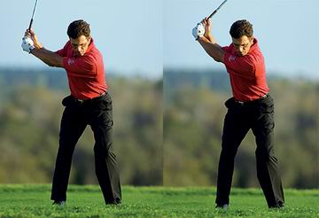 运用左肩带动上杆容易形成糟糕的转动,而且双臂动作不连贯。注意,我的双臂和球杆上杆到顶点时动作并不连贯。