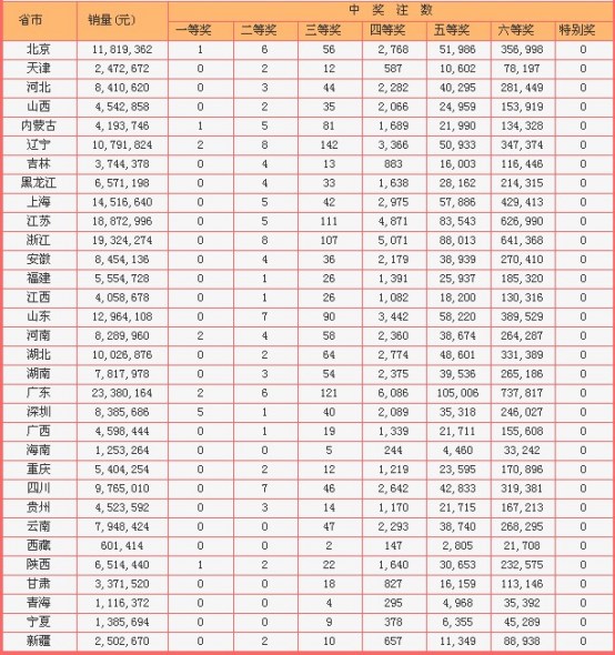 当晚98注二等奖被全国26个省市自治区彩民中得,其中辽宁和浙江彩民中得8注,山东和四川彩民中得7注,北京和广东彩民中得6注,上海、江苏和内蒙古中得5注较为突出。