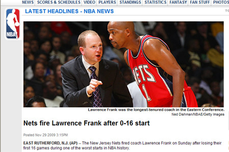 北京时间11月30日,据美联社报道,新泽西篮网正式解雇了主教练劳伦斯-弗兰克,理由是球队刚刚经历了开局16连败的惨状。