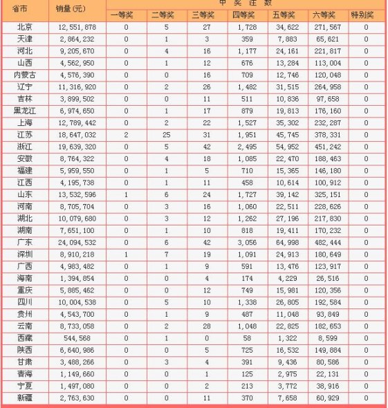 当晚二等奖开出91注26.6万,由全国26个联销省市和自治区彩民中得。其中独揽两注头奖的江苏还中得了25注二等奖,各获得一注头奖和深圳和山东也分别中得7注和6注二等奖。此外北京、浙江和四川中得5注,安徽和河北中得4注也较突出。
