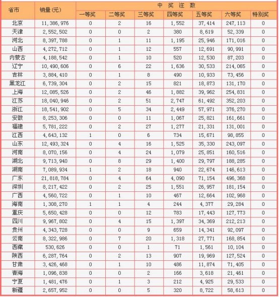 当期海南的千万大奖中出于陵水县,中奖彩票为一张10元机选单式票。当晚66注34万二等奖由全国25个联销省市自治区彩民中得,其中湖北8注、云南7注、辽宁6注、浙江5注、山东、河南和广东分别中4注较突出,其他各地均在3注以内。