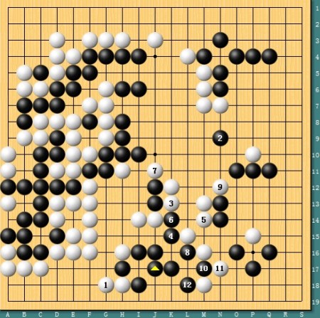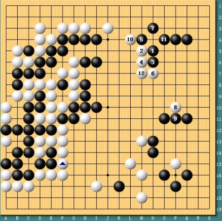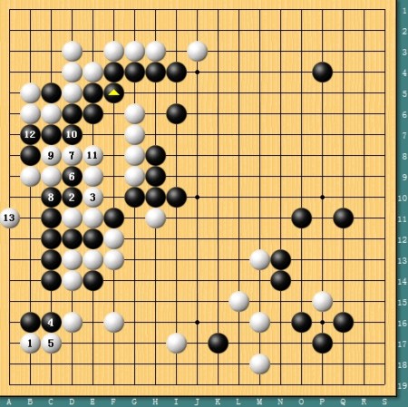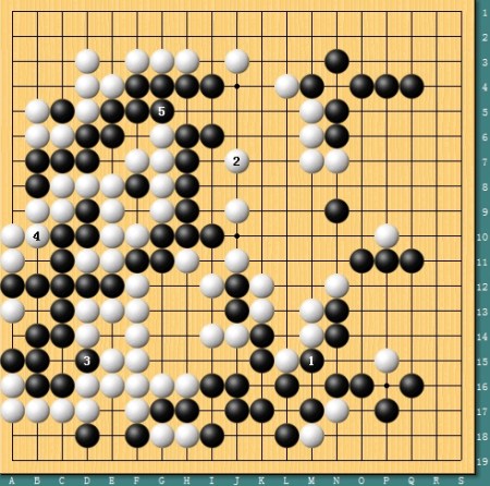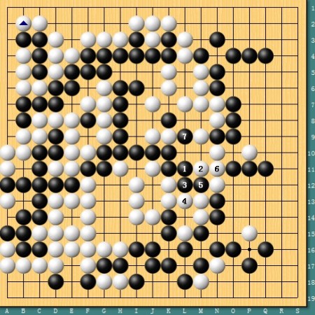 图七,简明获胜。实战中古力放弃了劫杀的变化,简单于1位将断点补牢,黑2挖后大龙已经净活。但白3-5后,全局黑棋实地已经差出很多,古力简明获胜。