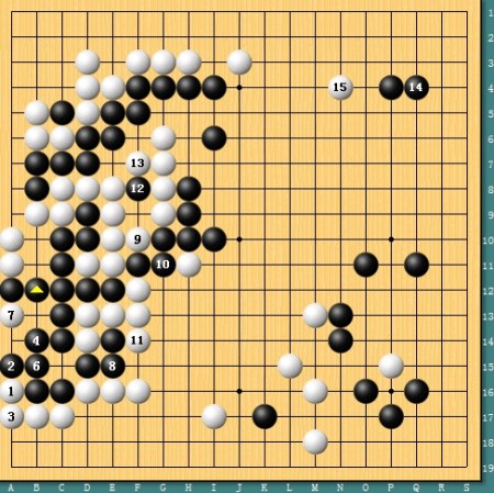 图一,古力执白VS邬光亚。序盘邬光亚的黑棋狂攻,白本可在10位断下左边2子回家,然而实战中古力却强行挡在1位,先守住左下角实地。黑无奈之下只好割断白棋,双方形成绞杀。