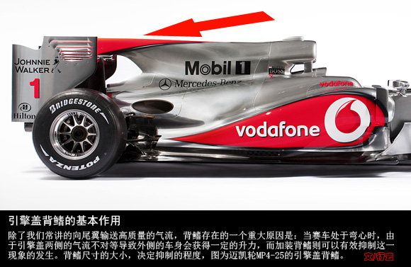 如果你观察梅赛德斯GP的引擎盖,很小的一片背鳍足以阻止这样的事情发生。它不需要拥有像其他赛车那么丑陋的外观(指大号引擎盖背鳍)。但是外观丑陋并不碍事,因为你可以张贴更大的广告。