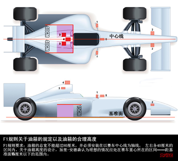 所以机械和空气动力学都决定了你不能将油箱做的傻高。与此同时,油箱的宽度在规则中也是定义了的,这方面一直都有规定——总宽0.8米,距赛车中心线不得超过0.4米。另外,赛车底盘的两侧一直都是由空气动力学决定的塑形——让散热器刚好装下,并保证理想的气流流经侧箱。