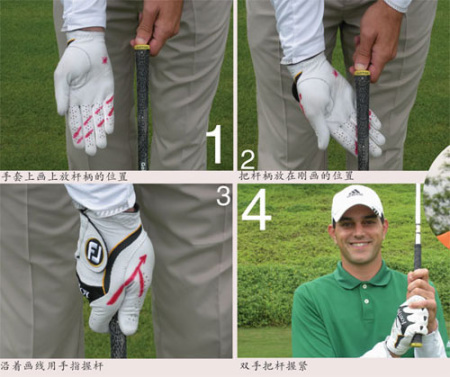 我们先来讨论这项运动最重要的一些部分,譬如基本动作中的握杆和站姿。这两项如此重要是因为高尔夫挥杆动作85 %的部分都受它们的控制。如果我们能正确拿杆,且正确做好击球准备动作,那我们击出扎实的球的机会将高出许多。请注意,我没有说击直!我说的是扎实,因为直球需要大量的练习。当我们开始拿球杆,非常重要的一点是将握把放在左手和右手的手指里,如图示。握把放在双手的手指里后,你会发现左右手虎口形成的" V ”字均指向我们的左肩膀。有人称这个是强势握杆,也有人说是中式握杆,但我称它为起始指向。这里有一个简单易懂的信息,为所有的高尔夫球手提供参考。当用手指握杆,在击球瞬间时,双手和双腕带动的动作不是翻转(fl ip ) ,而更类似于推动(roU ) ,这点我将在此系列的后面章节中解释。然而,我们应该敏锐地意识到:用手指握杆可收获更多的杆头速度和击球瞬间更方正的杆面,这样飞出去的球更直、更远。