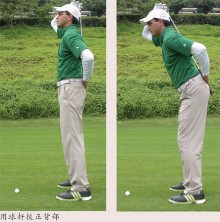 为了保持背部平直,你可以将球杆放在脊柱上来辅助(如右下图所示)。你应该能感觉到后脑、背的中间和下面部分都接触到了这支球杆。对很多人来说刚开始会觉得很别扭,但是一旦能击出第一个扎实的球,你将很愿意做出这么优秀的站姿。背部保持平直后,现在微微弯曲双膝,这样你的下半身也成了高尔夫挥杆的一个部分。只有你保持双膝有且仅有“微微”弯曲,你才能学会如何用下半身来产生更多的力量。很多人弯曲太多,所以要非常谨慎。