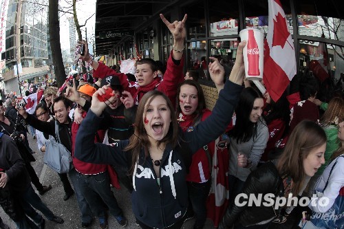 当地时间2月28日,加拿大球迷在温哥华街头庆祝加拿大队男子冰球队夺得金牌。当日,冬奥会男子冰球决赛在加拿大队与美国队之间展开,东道主加拿大队和美国队在常规赛时间2-2战平,突然死亡的加时赛加拿大队格罗斯比打进黄金入球,帮助加拿大队3-2绝杀美国队夺得冰球冠军。中新社发盛佳鹏 摄版权声明:凡注有“cnsphoto”字样的图片版权均属中国新闻网,未经书面授权,不得转载使用。【更多图片】