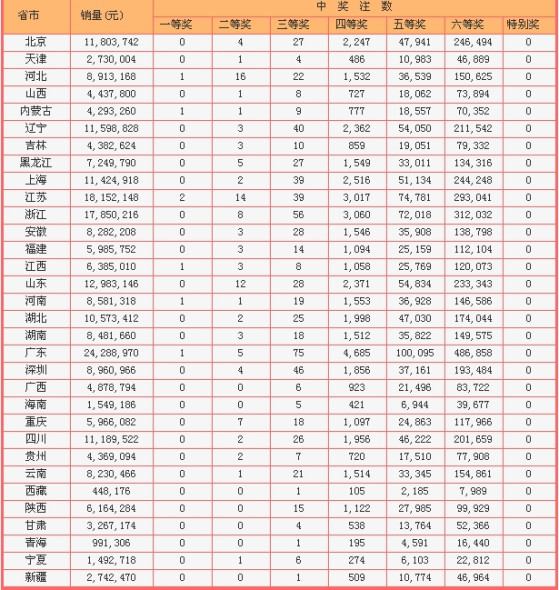 当晚107注二等奖花落全国25个联销省市自治区,其中三省超过10注:河北中16注、江苏中14注、山东中12注,河北和江苏同时中得头奖,而山东则无头奖中出。此外浙江8注、重庆7注、黑龙江和广东获5注也较幸运。