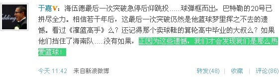 边看球边微博聊天实乃一大乐事,平静下来的于嘉也谈到了篮球运动残酷的一面,但是正是因为不完美,才让我们如此热爱这项运动。
