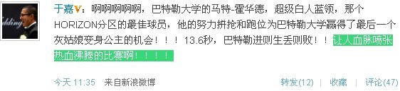 作为通往NBA赛场的跳板,NCCA决赛的精彩程度丝毫不含水分!于嘉也在情不自禁的在微博上发出一连串感叹号表达自己对比赛的欣赏。