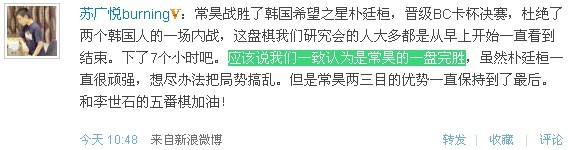 不久前中国棋手常昊九段在本局中执白290手中盘击败韩国新星朴廷桓七段,前者将与韩国第一人李世石九段争夺本届比赛的冠军。苏广悦在微博上点评比赛,认为常昊占据了绝对的优势。
