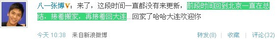 八一小将张博在微博上消失了一阵子,人们纷纷猜测他干嘛去了,还不等大家细想,他就大大咧咧的回来了,并通告了自己过去一段时间的行程。