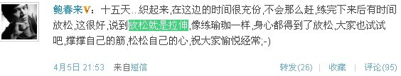 作为专业的运动员,鲍春来的放松招式很值得参考,他在训练之余和大家交流放松的办法啊,并希望能够让大家愉悦身心。