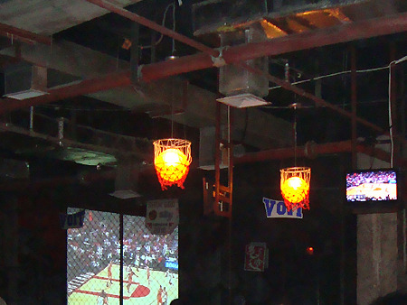 整座酒吧共有12个卡座和40余个散座,整体建筑和内部装饰风格以浓重的篮球氛围及北美Hip-Hop文化气息为主基调。走进酒吧内场,通体的银色水泥柱和金属铁网夺人眼球。四壁上布满个性张扬的涂鸦画,显然是经过了一番精心的设计,给人极大的视觉冲击力。既然是篮球概念酒吧,那么篮球元素肯定是必不可少:篮球形状的吊灯、超大幅的NBA巨星海报、高高悬挂的NBA众巨星战袍、以及大量珍贵的NBA历史影像资料…所有这一切,仿佛让你置身于一个篮球的海洋,使身为球迷的我们徜徉其中,无法自拔。
